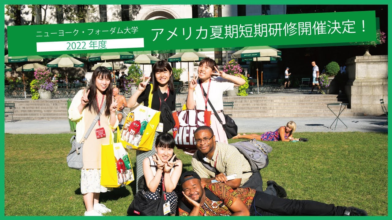 - 2022年度夏、ニューヨーク・フォーダム大学でのアメリカ夏期短期研修の開催が決定しました。異文化に触れ、視野を広げる体験ができます!ぜひご参加を検討ください!