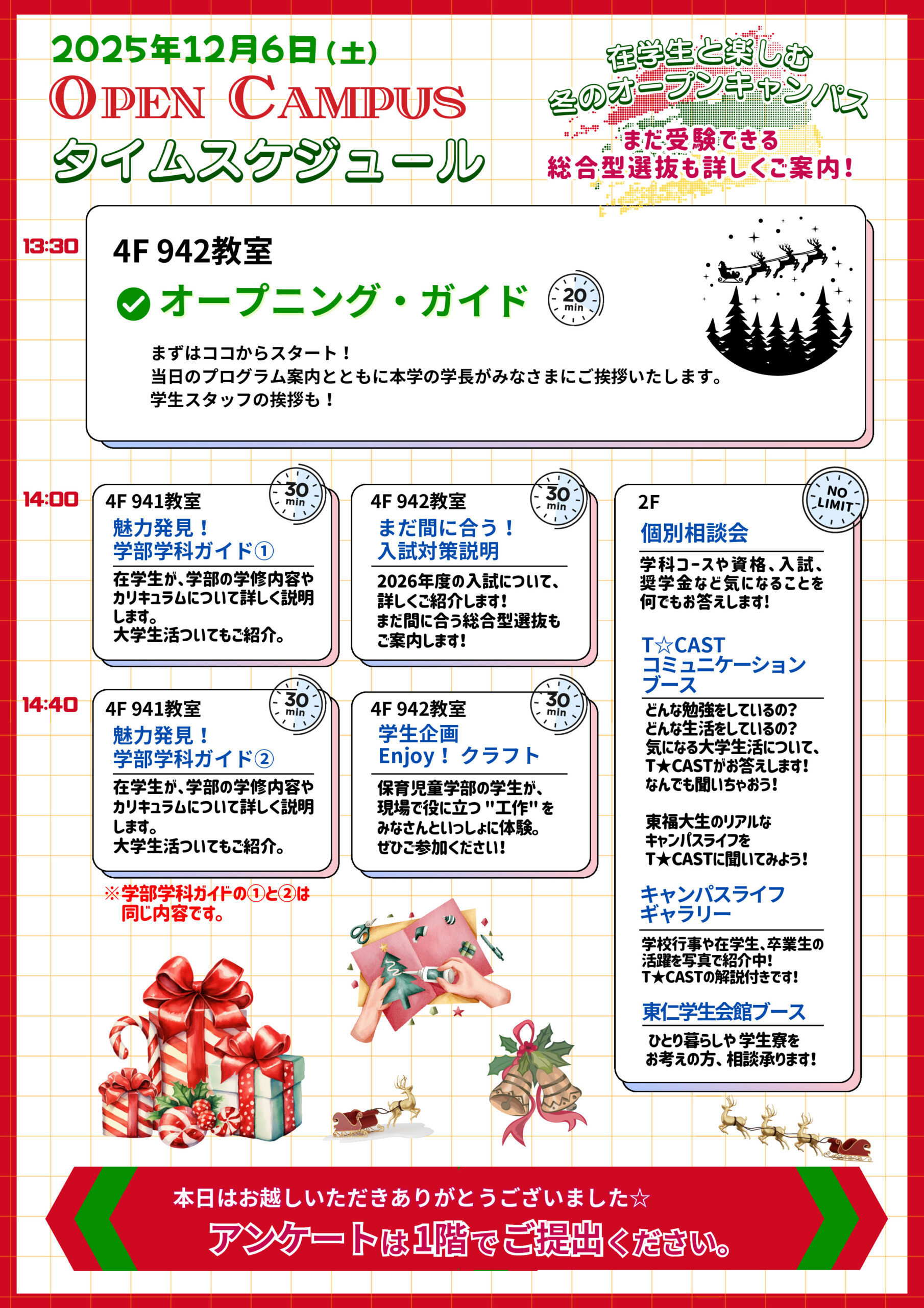 今回は、「在学生と楽しむ冬のオープンキャンパス~まだ受験できる総合型選抜も詳しくご案内!~」と題して、本学のこれからの入試を詳しくご紹介する説明のほか、学部説明や「enjoyクラフト」を実施します。また、在学生が紹介する学部説明や個別相談など、希望に合わせたプログラムに参加できます。